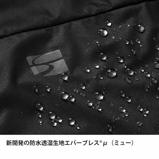 独自開発の防水透湿生地「エバーブレス®ミュー」を採用、その極薄無孔質メンブレンは、従来のエバーブレス®メンブレンと比べ約1/3の薄さを誇ります。無孔質ながら水で膨潤しにくく、速乾性と透湿性に優れるため、発汗の多い場面でも蒸れを感じにくく快適が持続。秋~冬はもちろん、春~初夏など汗をかくシーズンも使いやすい。