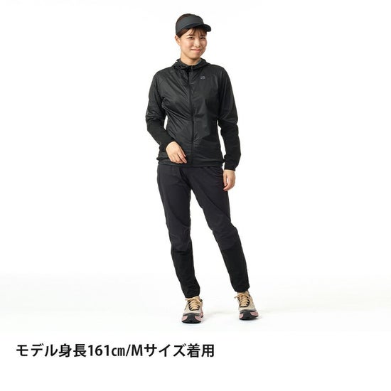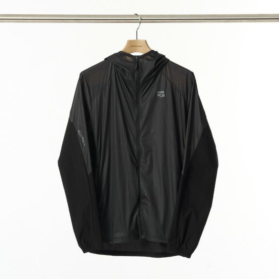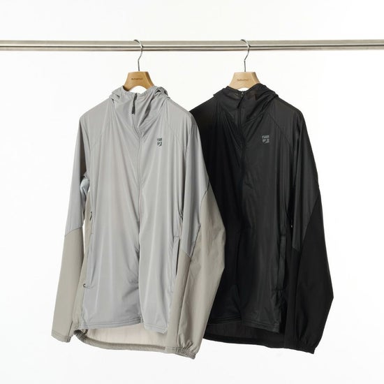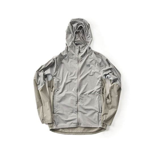 背面は、通気性と撥水性を備えた薄手ストレッチ素材で軽やかに仕立てています。また、ランニングに快適なギミックを各所に配置。右ハンドポケット裏は本体を収納できるポケッタブル仕様で携帯性に優れます。フードは、頭部にフィットするミニマルデザインで、使用しないときは襟元にまとめることが可能。