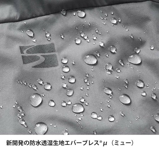 独自開発の防水透湿生地「エバーブレス®ミュー」を採用、その極薄無孔質メンブレンは、従来のエバーブレス®メンブレンと比べ約1/3の薄さを誇ります。無孔質ながら水で膨潤しにくく、速乾性と透湿性に優れるため、発汗の多い場面でも蒸れを感じにくく快適が持続。秋~冬はもちろん、春~初夏など汗をかくシーズンも使いやすい。