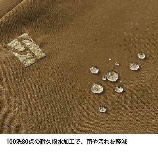 100洗80点以上の優れた耐久撥水性で多少の雨や雪を弾き、高密度に織られた生地による高い防風性を備えています。