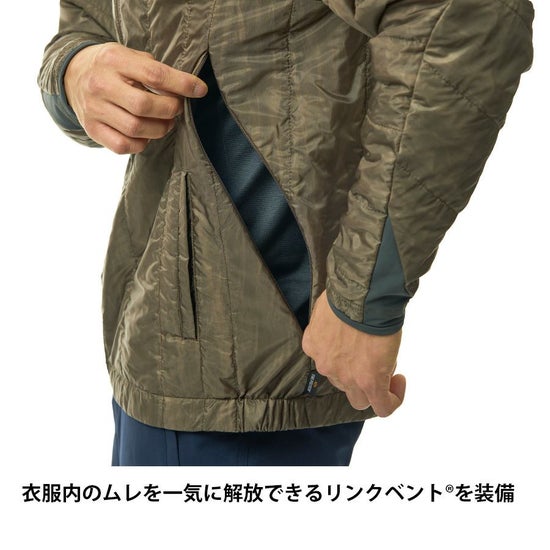 保温素材として独自開発の「ファインポリゴン®」を封入。汗・水・雪・結露などで濡れた際もロフトを維持し、保温力を確保できます。