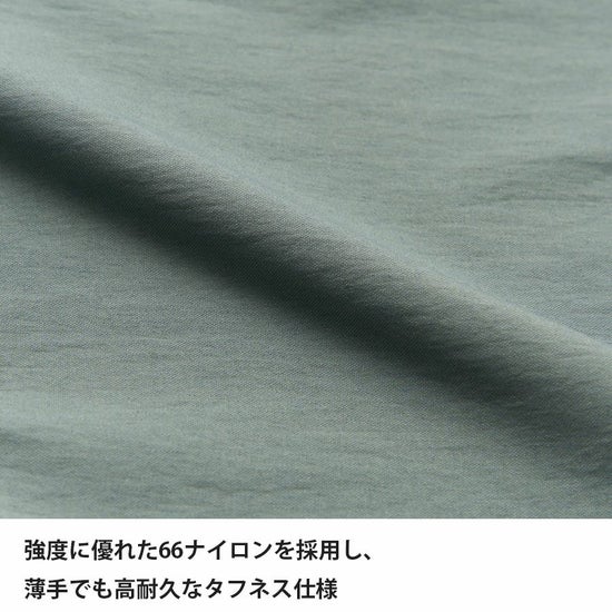 生地には強度に優れた66ナイロンストレッチ生地を採用。極薄手でありながら擦れや引き裂きに強く、山の行動にも安心して使えるタフさを備えています。生地には耐久撥水加工を施し、不意の小雨や朝露にも対応。夏の行動を妨げない、過不足のない機能バランスです。