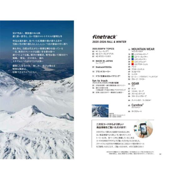 finetrackカタログで使用している写真は全て、「遊び手=創り手」としてfinetrackのスタッフや仲間達が日本や海外のアウトドアフィールドにて撮影したものです。 これらの写真を見るだけでも、次のフィールドへ向けて心躍る、楽しめるカタログです。