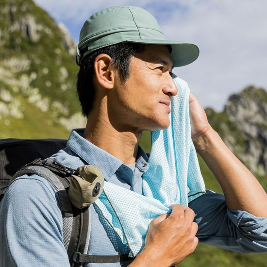 もちろん普通に汗を拭くこともでき、乾きも速いタオルです。また、クーリング性能にも優れ、水で濡らして首に巻けば、炎天下でもひんやりしたクール感が得られます。