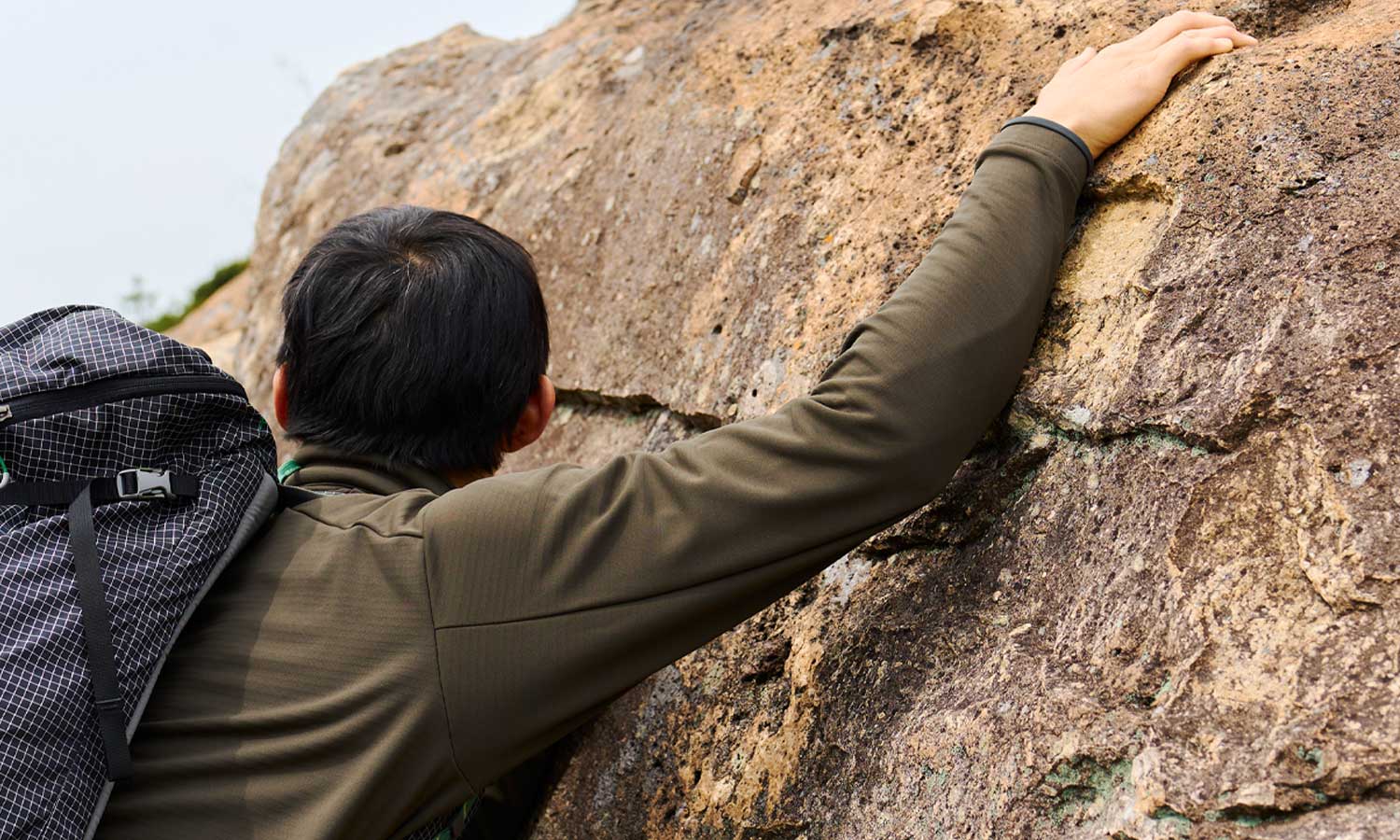 糸使いと編み組織の工夫で、表面強度を出すことが難しいニット地においても必要十分な強度を実現。岩稜地帯の歩行でも安心の生地表面の強度です。耐摩耗試験の中でも厳しい条件のスナッグD-3法(金鋸法)※で4-5級(MAX5級)の耐久性を誇ります。