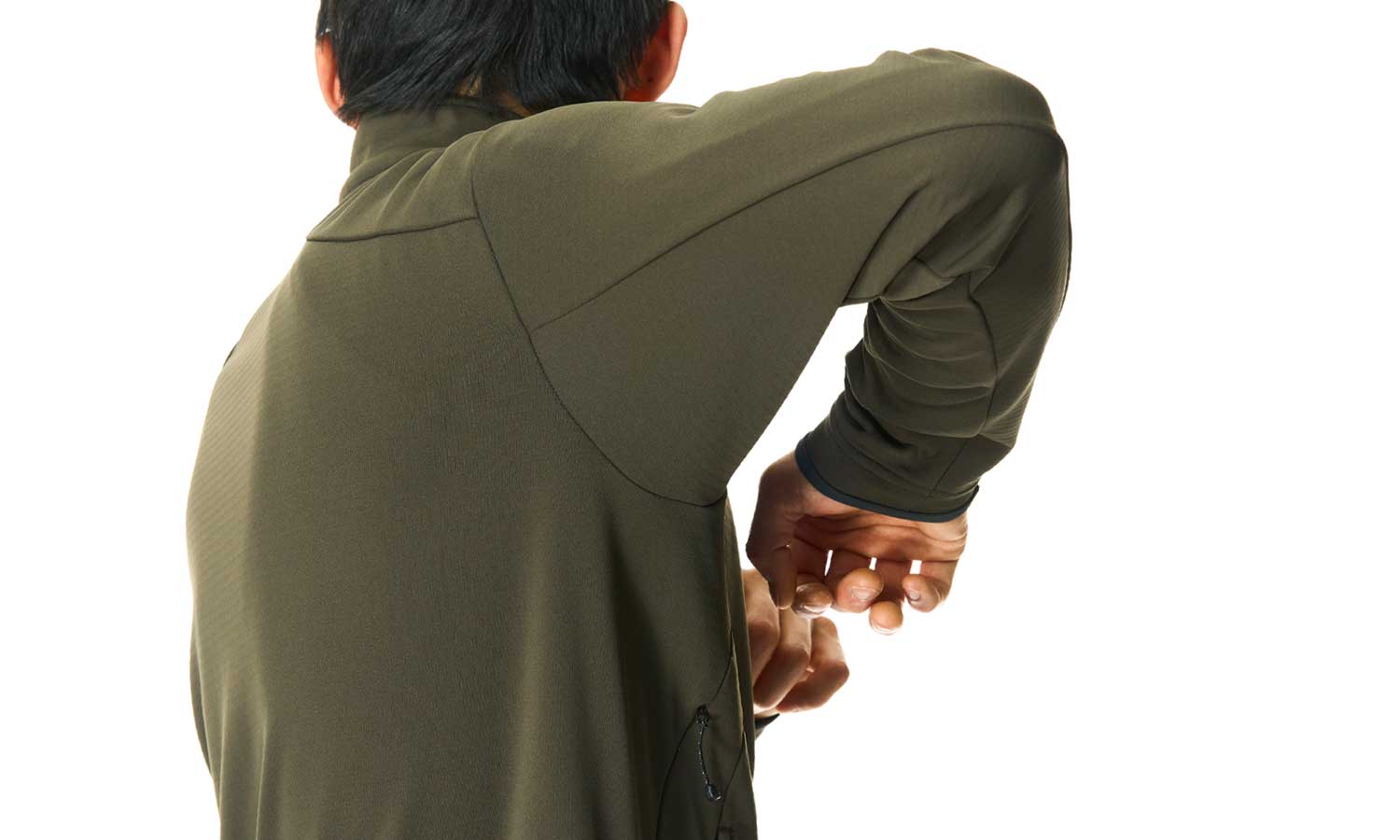 フロントファスナーには、生地同士の突合せで縫製する「TPS縫製(FTPS縫製)」を採用しました。本体生地とファスナー地とを重ねないため、その分柔らかく、快適な着心地です。レイヤリングの際にごわつきにくくなっています。