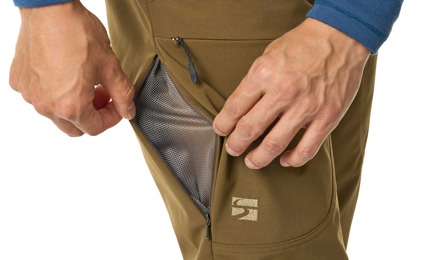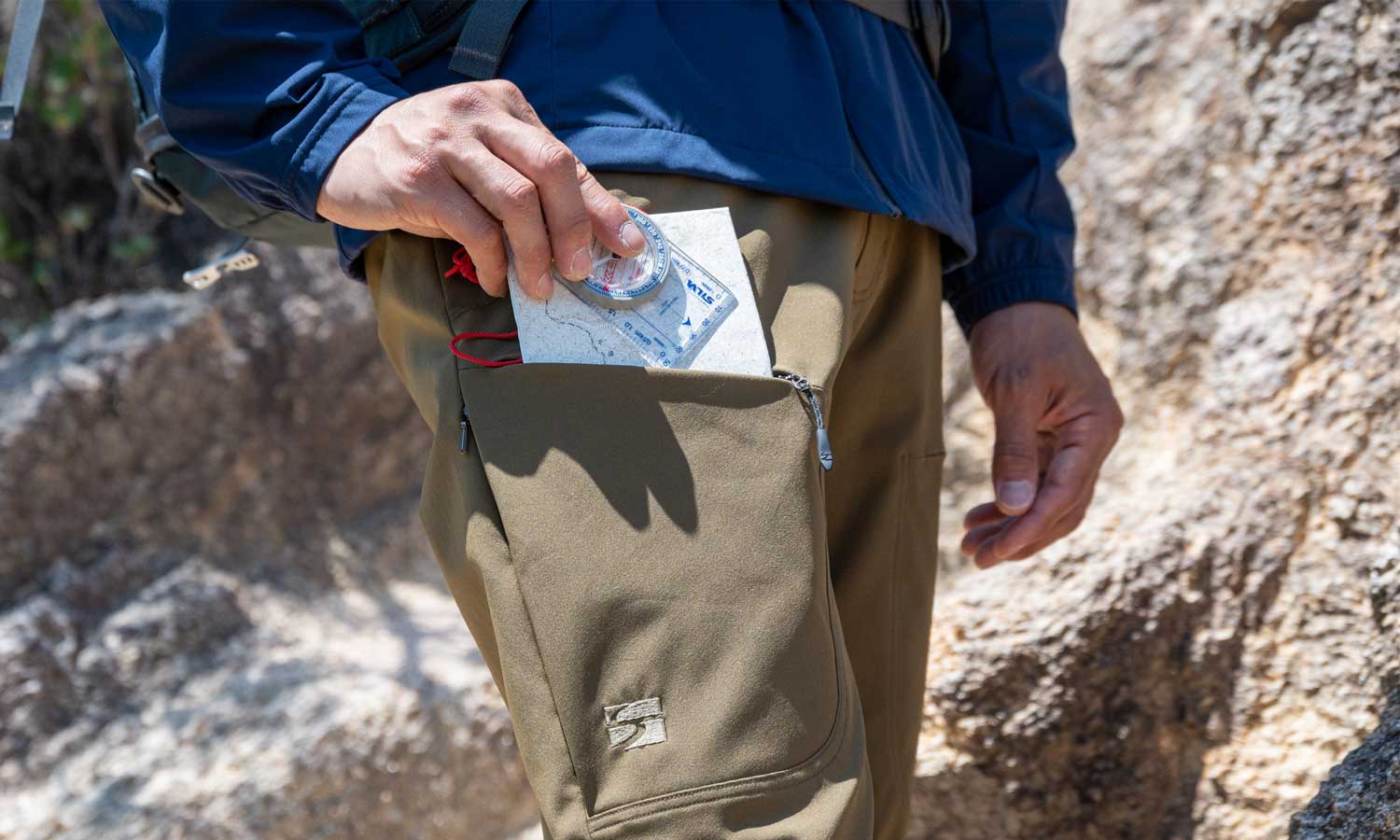 太腿部に足上げ動作に干渉しにくい特徴的な大型ポケットを配置。地図やコンパス、スマートフォンなど使用頻度の高いアイテムの収納に便利です。