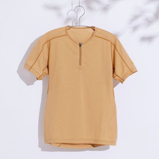高さを抑えた襟、開放するフロントジップで「涼しさ」に特化したジップTです。