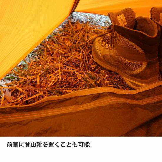 前室付きのシングルウォール構造で最低2本のペグダウンで設営可能な非自立タイプ。