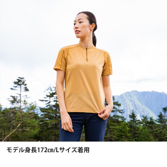 高さを抑えた襟、開放するフロントジップで「涼しさ」に特化したジップTです。
