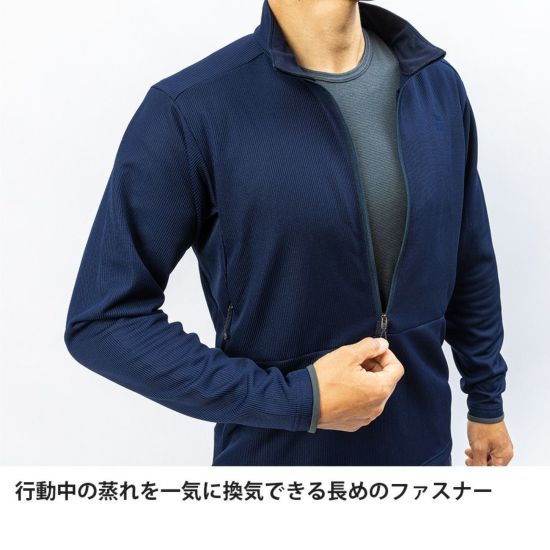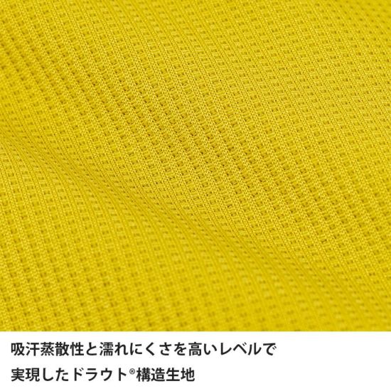 吸汗蒸散性を高いレベルで実現したドラウト®構造生地により、行動中の汗濡れや蒸れを抑えながら、適度な保温性を発揮します。