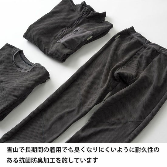 表面側は立体構造、肌面側は微起毛をかけることで、吸汗性と軽量性を損なわずに最大限の保温力を発揮できるように設計。厚手ベースレイヤーの弱点である「乾きにくさ」「重さ」を克服しました。