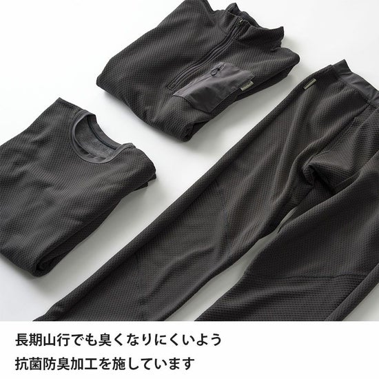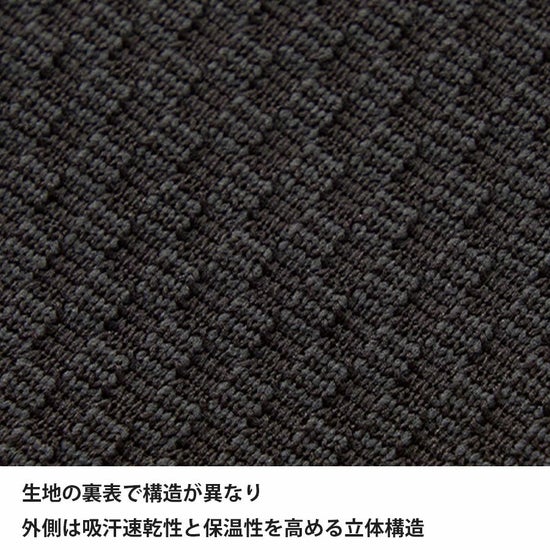 表面側は立体構造、肌面側は微起毛をかけることで、吸汗性と軽量性を損なわずに最大限の保温力を発揮できるように設計。厚手ベースレイヤーの弱点である「乾きにくさ」「重さ」を克服しました。