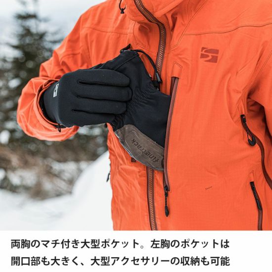 パウダースカートや大型アクセサリの収納が可能な胸ポケットなど、雪山での幅広いアクティビティに対応します。