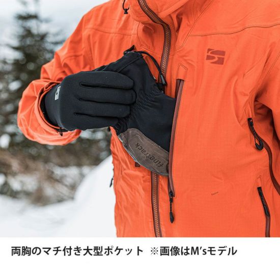 パウダースカートや大型アクセサリの収納が可能な胸ポケットなど、雪山での幅広いアクティビティに対応します。