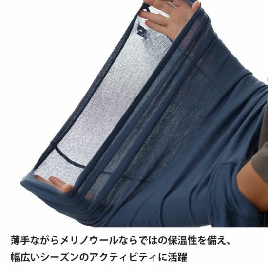メリノウール本来の保温・調湿性と高機能ポリエステルの吸汗速乾加工を兼ね備えているため、蒸れにくく汗を素早く乾かします。