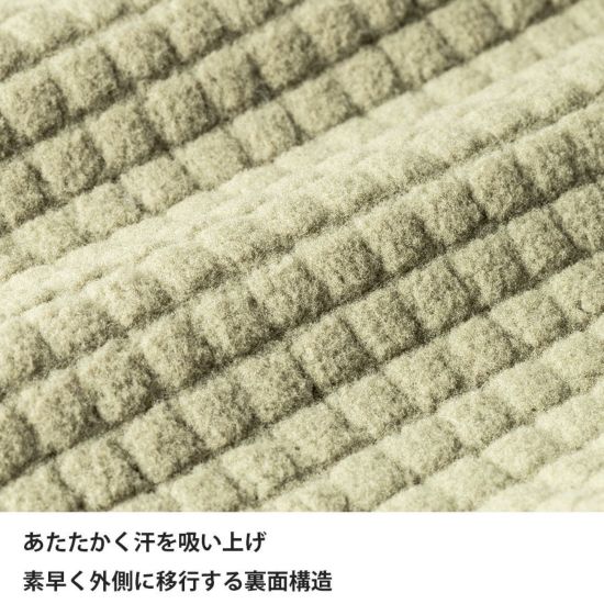 繊維一本一本を立ち上げることかさ高性を出す「立毛」により、スムーズな吸水・拡散を実現したドラウト®ソルは厚手のミッドレイヤーでありながら春夏用のベースレイヤーに匹敵するほどの速乾性・吸汗拡散性を備えました。