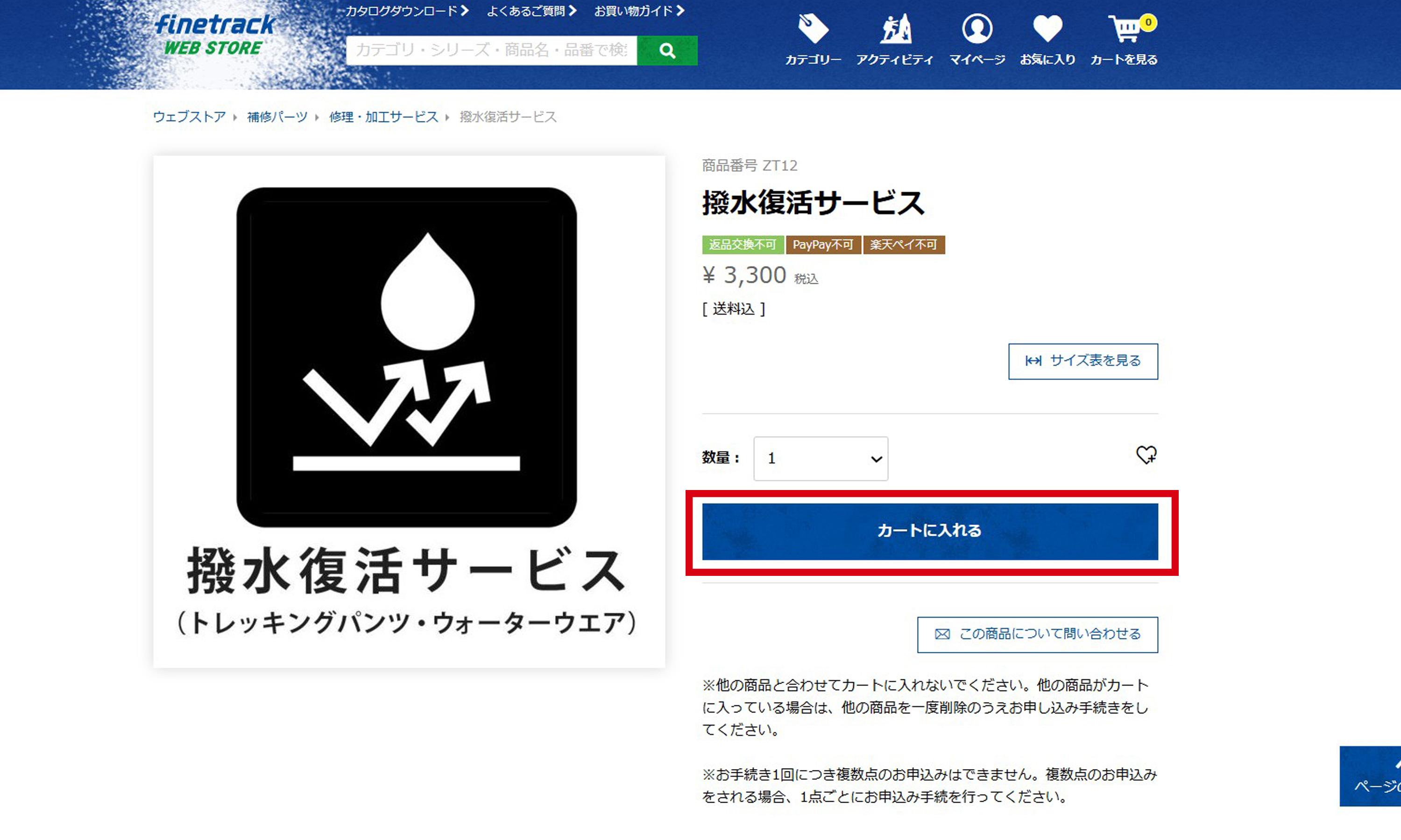 finetrack製品の「撥水復活サービス」お申込み用のページです