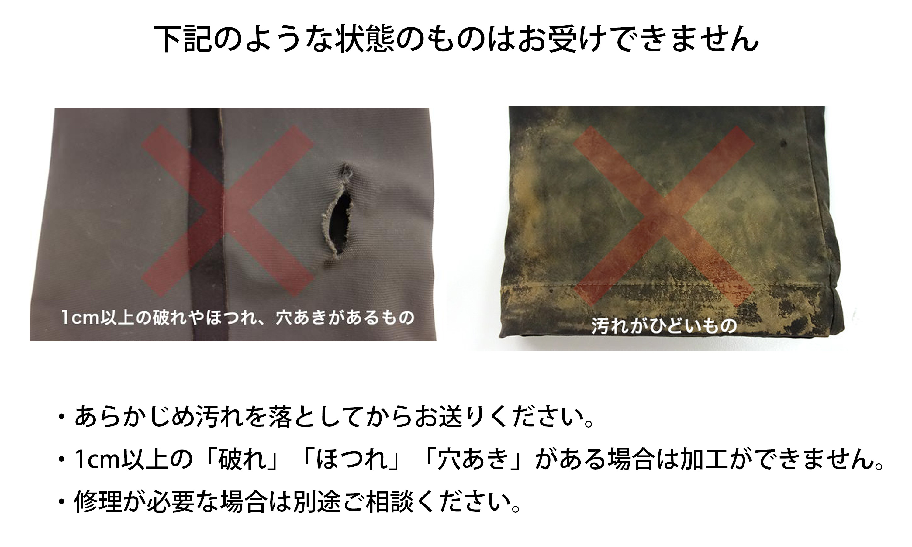 - 商品や損傷の状態により、追加料金をいただく場合や加工不能と判断させていただく場合がございます。