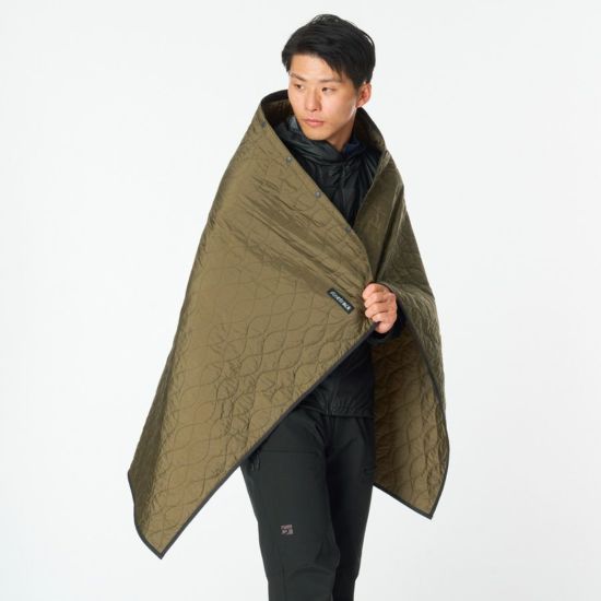 濡れに強く温かい独自素材の保温素材「ファインポリゴン®」を封入したブランケット。ひざ掛けとしての使用はもちろん、巻きスカートやマントにも形を変えて、マルチに活躍。