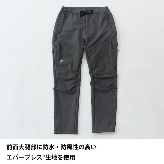 本体には、50洗80点の耐久撥水加工を施したかさ高で温かい独自開発生地を。太腿部の前面と尻部分には、防風性と耐水性を併せ持つエバーブレス®生地を採用。