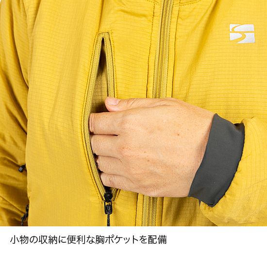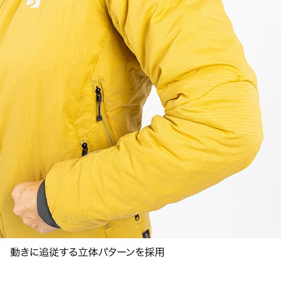 表地に軽量なストレッチ布帛生地を採用。体の動きにフィットする立体パターンによって、動きやすさと着心地の軽さを両立しています。