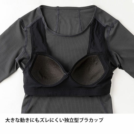 さらにブラカップ部分を独立構造にすることで、腕上げ時や上体をひねる動きの際にもバストにしっかりとフィットし、ズレ上がりやヨレ感を抑えます。