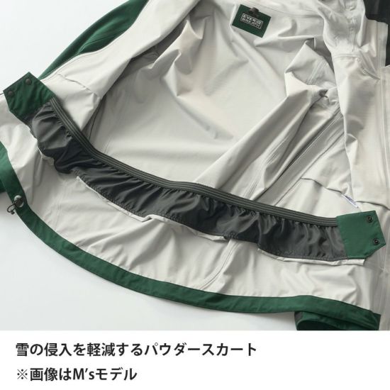 バックカントリースキーや雪山のラッセル時の雪の侵入を抑えるため、ウエスト内側にパウダースカートを装備。
