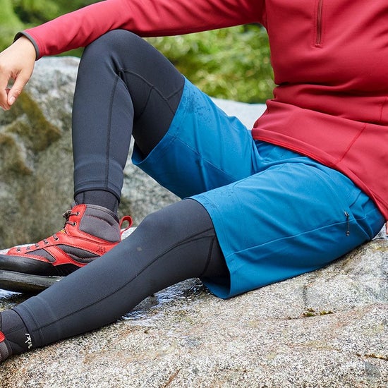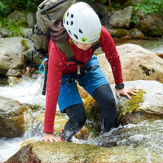 タテヨコに伸びて岩場や沢中などでの大きなアクションでもストレスフリーの動きやすさを備えます。