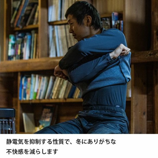 調湿性に優れたキュプラと、高い吸汗速乾性を備えた特殊ポリエステルを組み合わせた独自ハイブリット生地を採用。高い保温力、速乾性、調湿性を兼ね備えています。