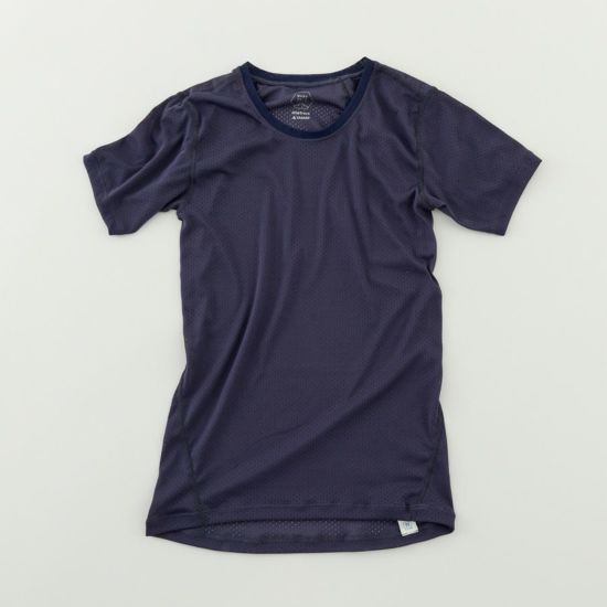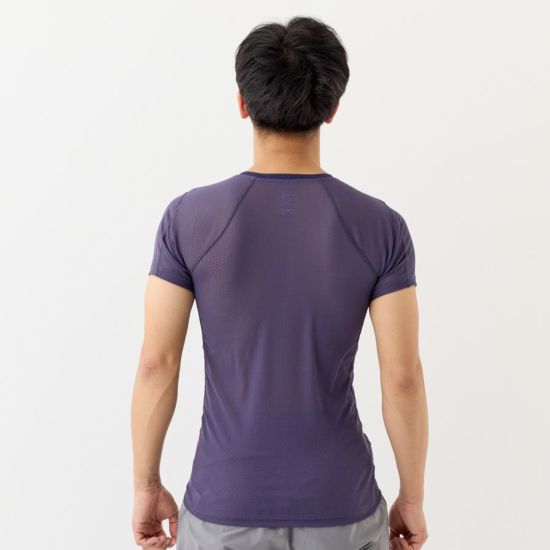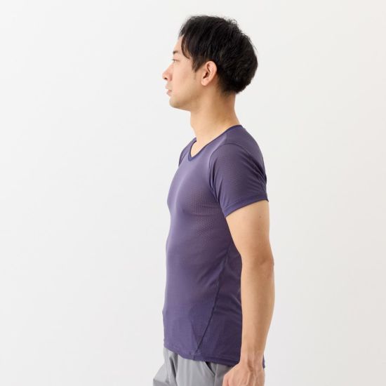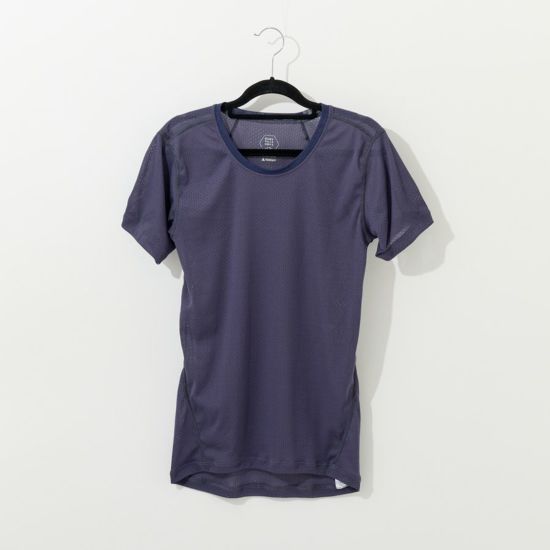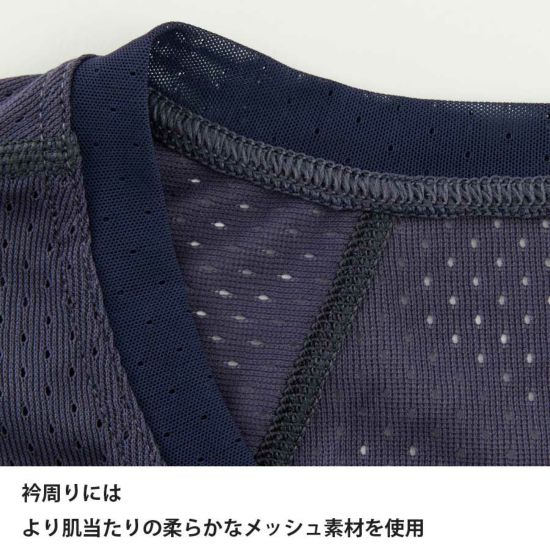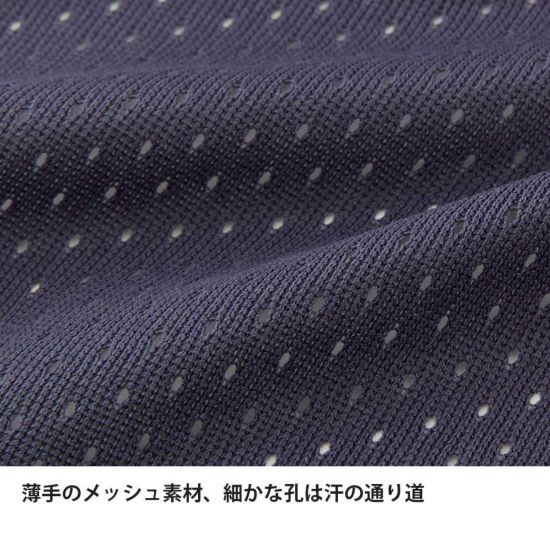 縫い目は肌あたりの優しいフラットシーマ、首回りや袖口には滑らかなメッシュを配置。本体生地も伸びの良い柔らかなメッシュ地で、軽くソフトな着心地です。