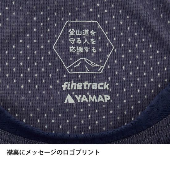 襟裏にはメッセージのロゴプリント。「登山道を守る人を応援する」プロジェクトに協働する、finetrackブランドストアと「YAMAP STORE」だけの限定販売です。直営店舗finetrack TOKYO BASE>>ではご試着もいただけます。