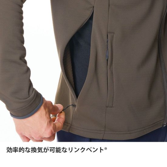 フロントファスナーには、生地同士の突合せで縫製する「TPS縫製(FTPS縫製)」を採用しました。本体生地とファスナー地とを重ねないため、その分柔らかく、快適な着心地です。レイヤリングの際にごわつきにくくなっています。