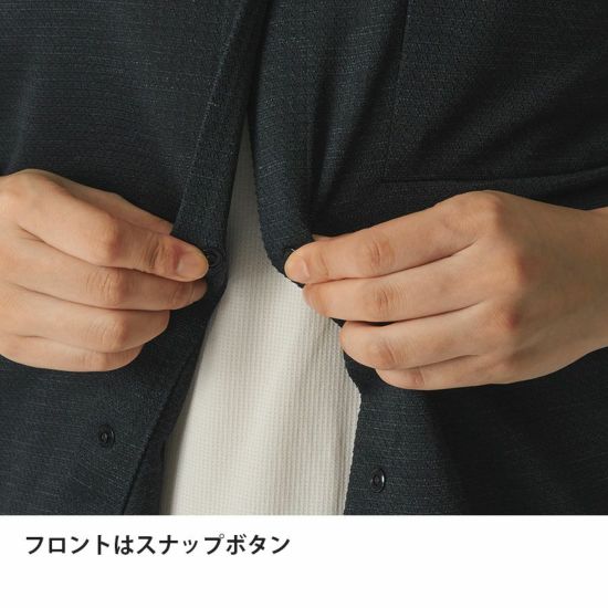 襟元やフロントのボタンを外せば、さらに風を取り込むことができて、温度調整も自在です。