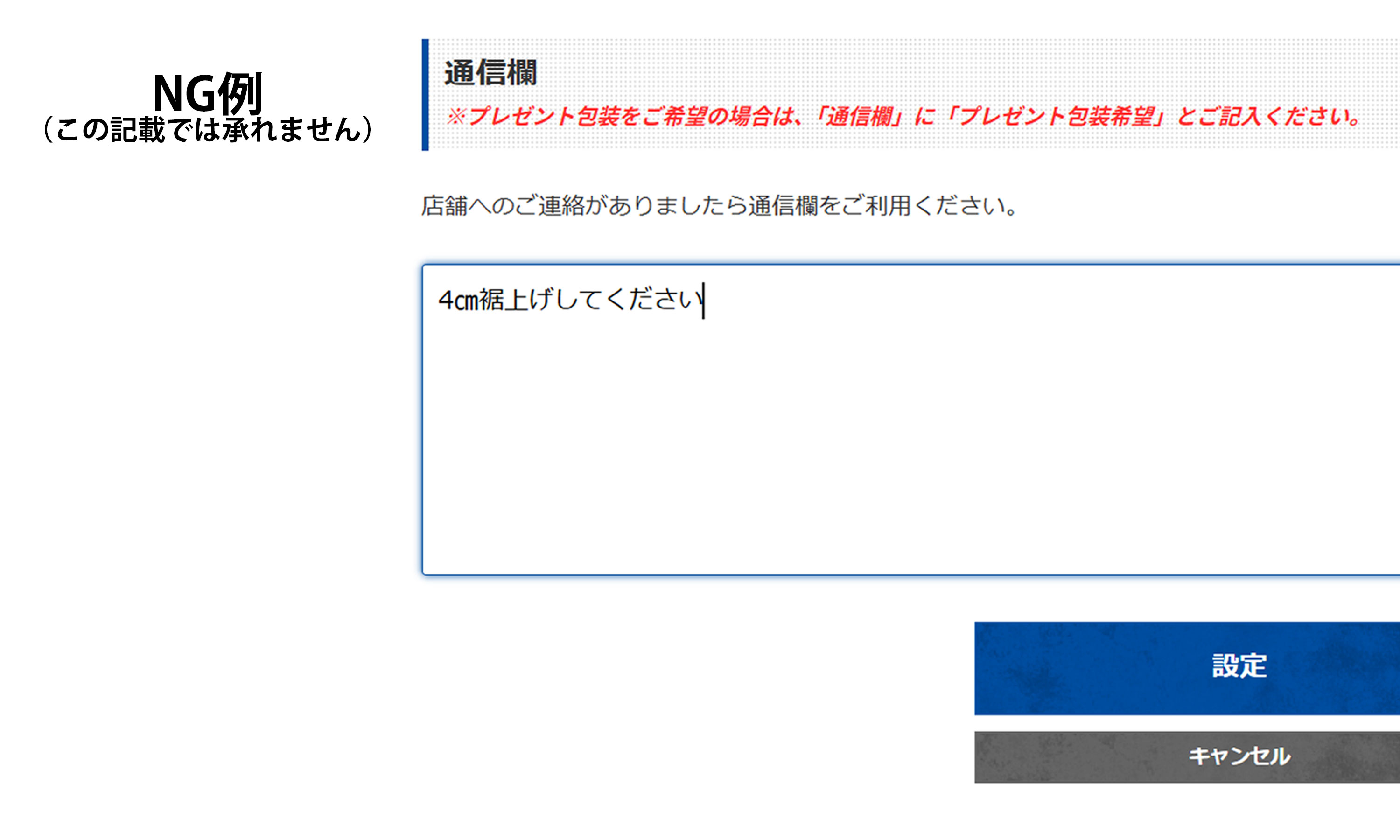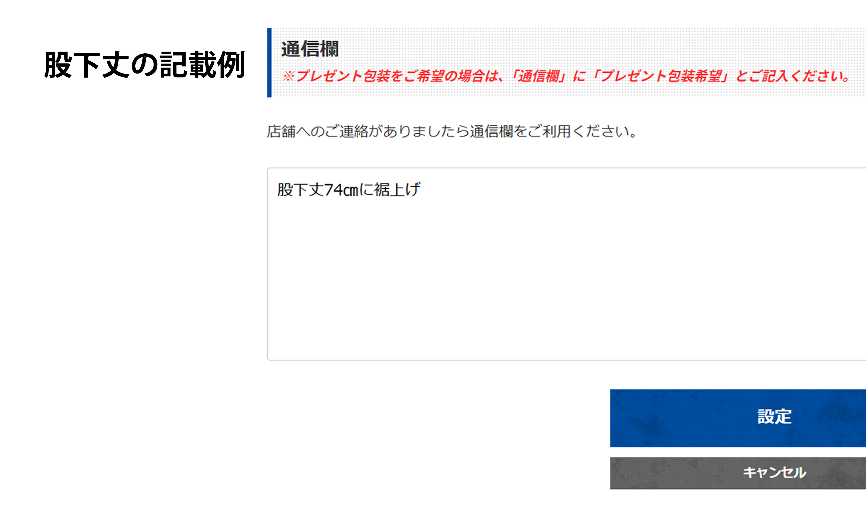 ※「3㎝裾上げ希望」等の記載では、ご希望の股下丈と大幅にずれる可能性があるため承ることができません。必ずご希望の股下の長さをご記入ください。