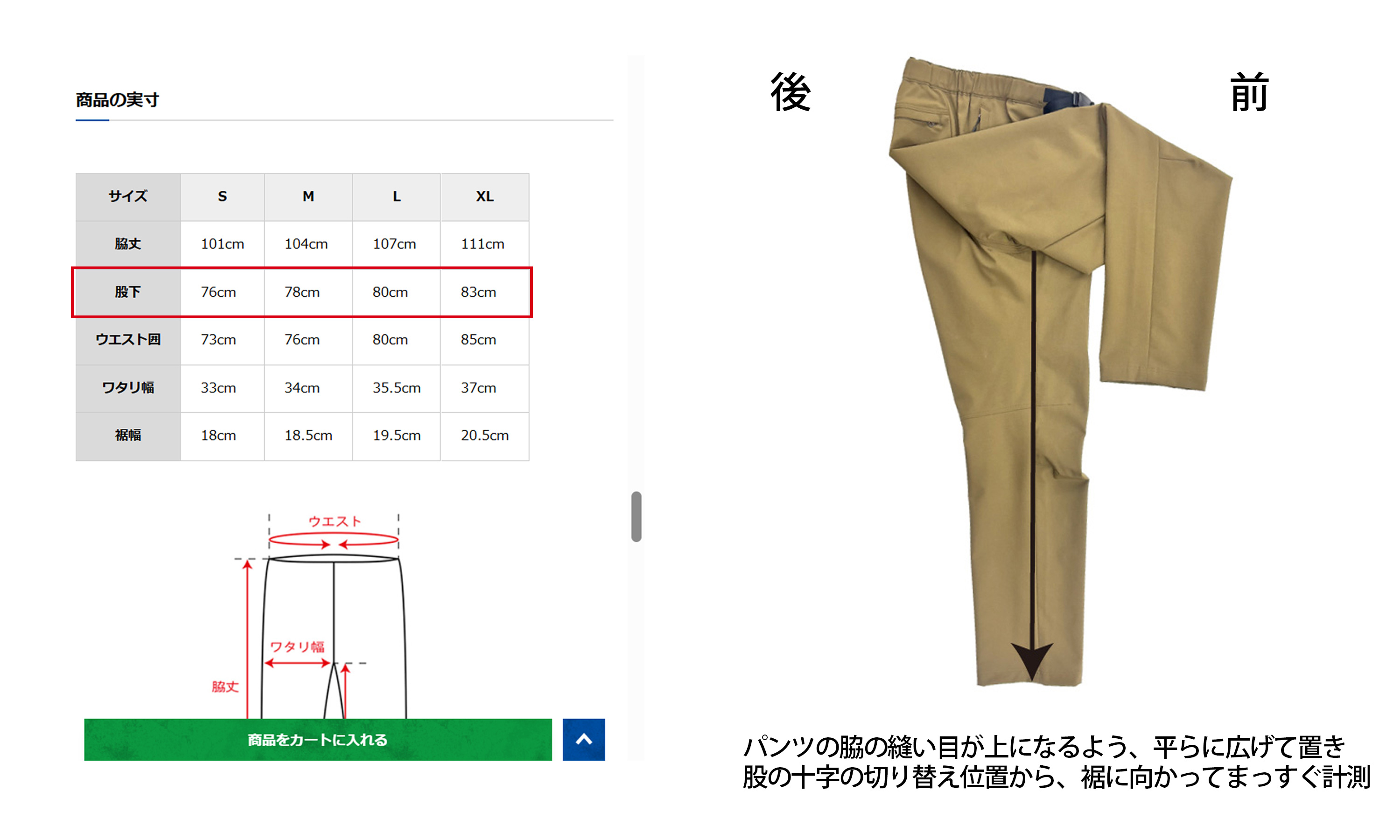 股下丈は、裾上げご依頼の商品詳細ページに記載の「商品の実寸」の「股下」を参考にご指定ください。