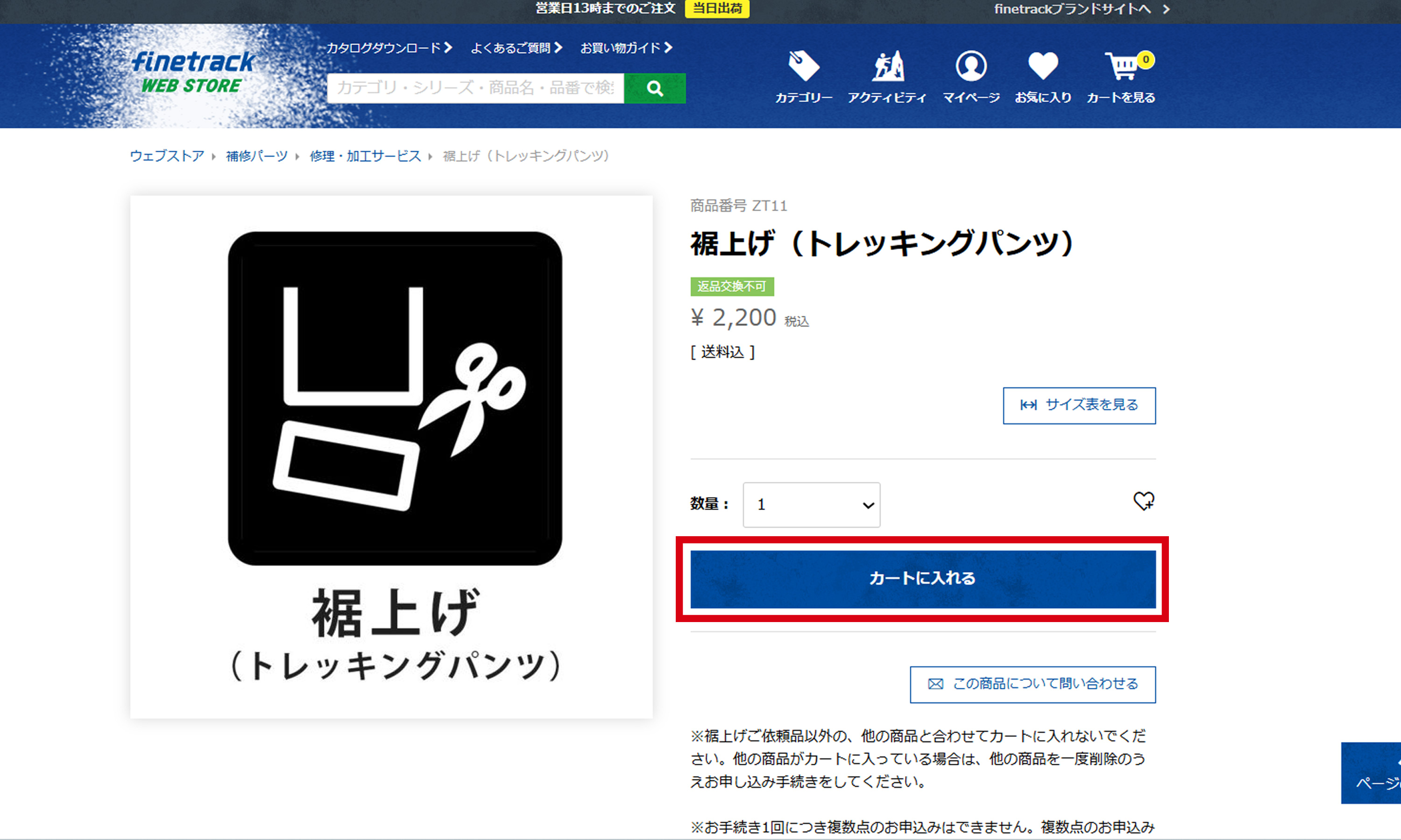 finetrack製品の「裾上げ」お申込み用のページです