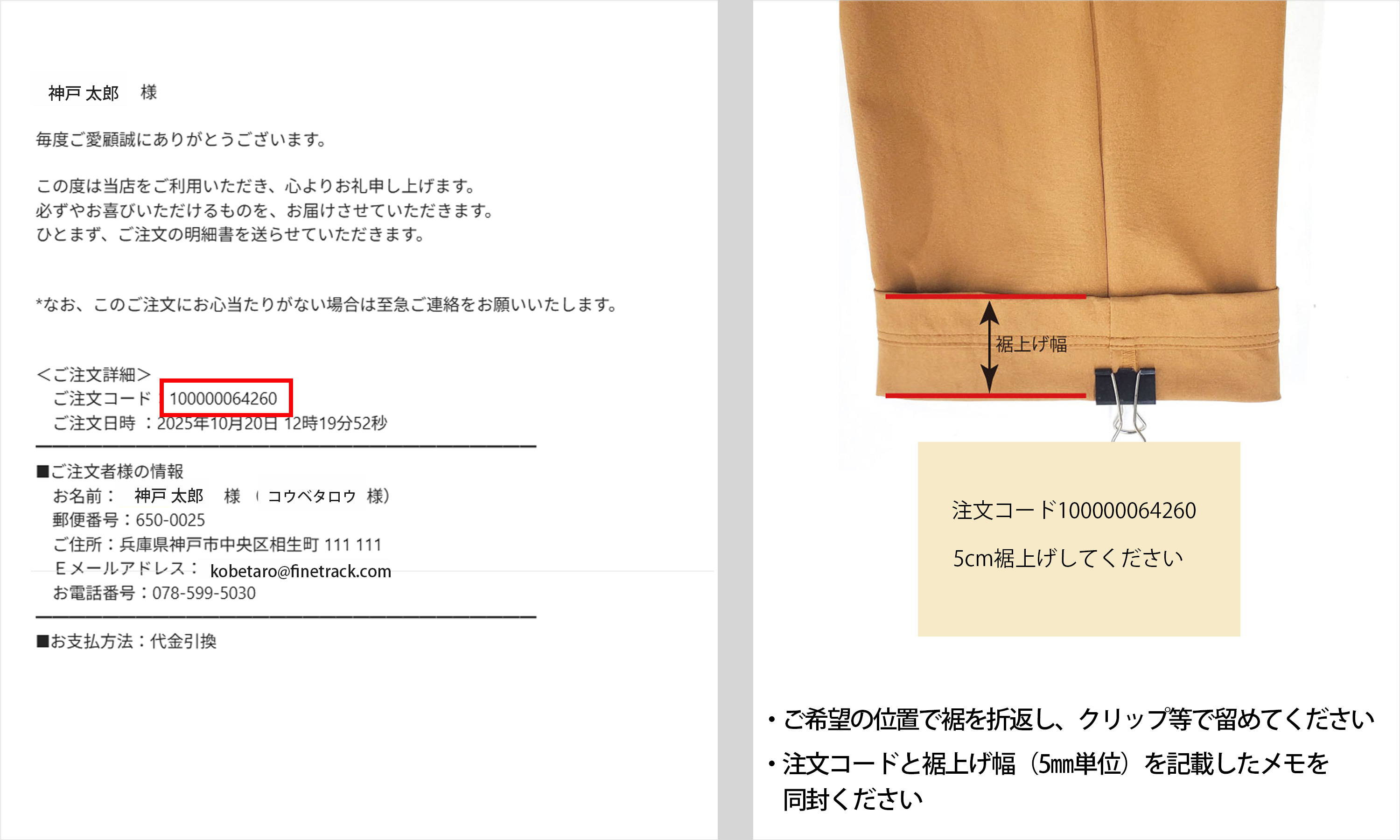 - 裾上げにあたり確認事項などがある場合は、ご登録のメールアドレスへご連絡させていただきます。(メールのドメイン指定受信拒否設定などされている場合は、下記ドメインを受信できるよう設定してください。