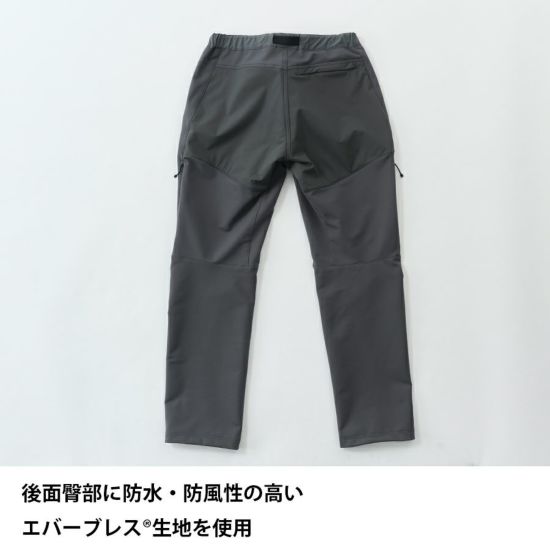 本体には、50洗80点の耐久撥水加工を施したかさ高で温かい独自開発生地を。太腿部の前面と尻部分には、防風性と耐水性を併せ持つエバーブレス®生地を採用。