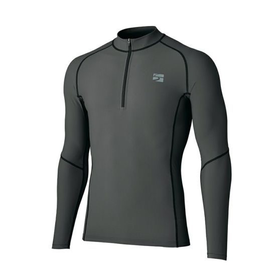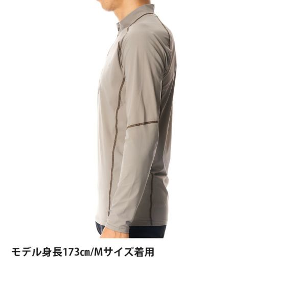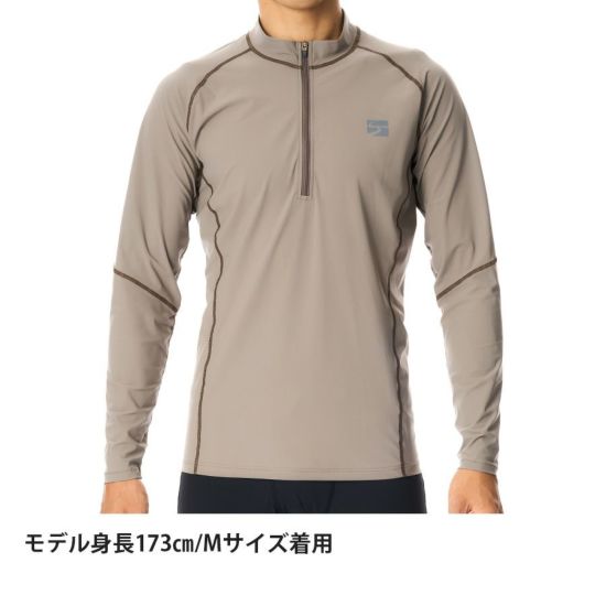 フロントジップで着脱や温度調節ががしやすく、日差しや擦れから首回りを保護するジップネックタイプです。