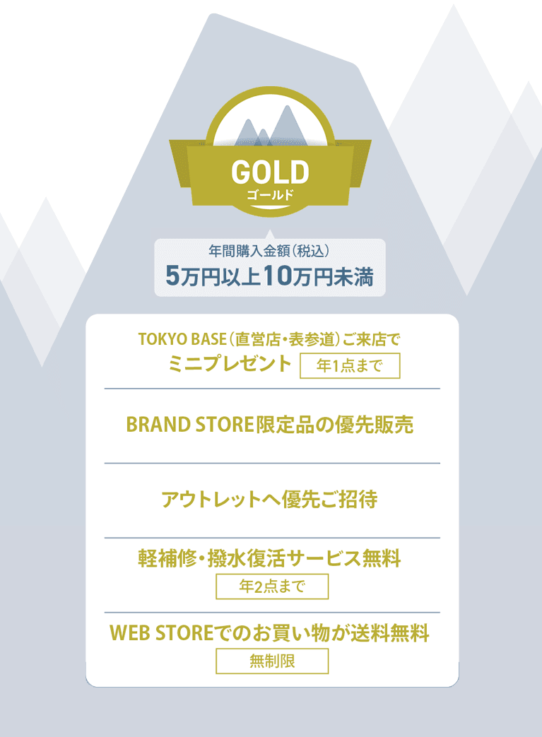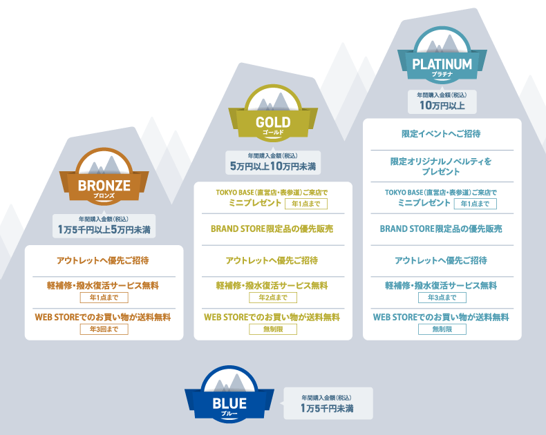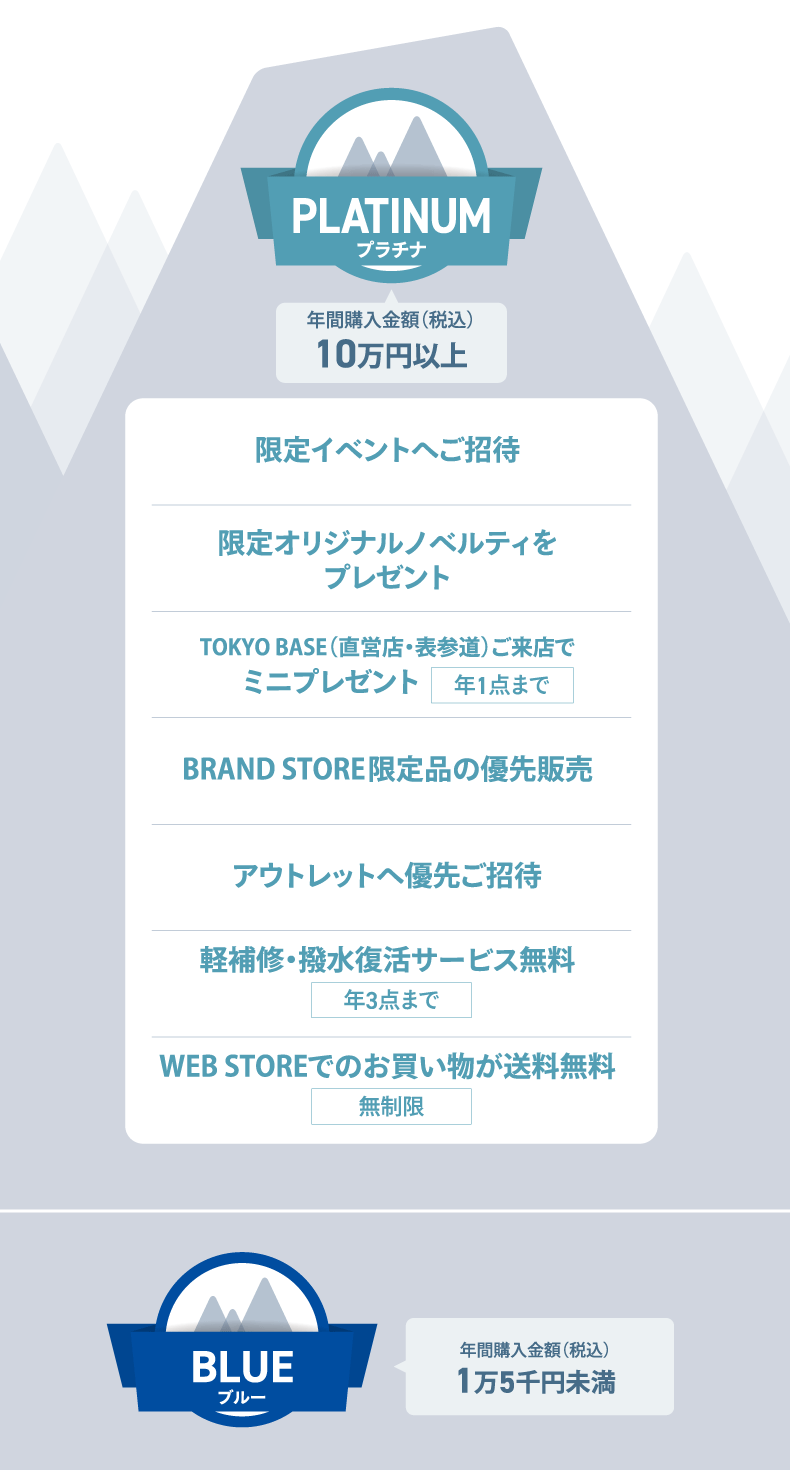 | 算定基準 | WEB STORE:ご注文日を基準に計算(当社からの出荷済のご注文が算定対象) TOKYO BASE:店頭でのご購入日を基準に計算 |