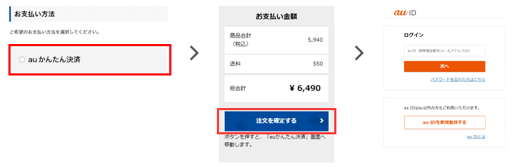 お支払方法に「auかんたん決済」をご選択いただき、「注文を確定する」ボタンをクリックするとauIDログイン画面へ移動します。お客さまの「auID」「パスワード」を入力し、ログイン後に決済へと進みます。決済が完了すると、当サイトのご注文完了画面へ遷移します。
