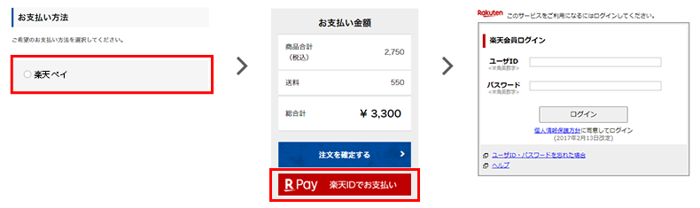 お支払方法に「楽天ペイ」をご選択いただくと、「R Pay 楽天IDでお支払い」というボタンが出現します。ボタンをクリックして楽天会員ログイン画面へ移動し、楽天IDとパスワードを入力します。ログイン後、クレジットカード情報を入力する必要なく決済へと進みます。