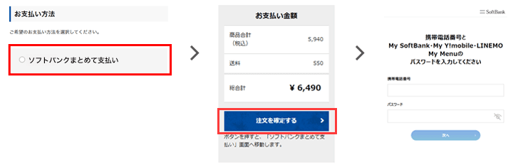 お支払方法に「ソフトバンクまとめて支払い」をご選択いただき、「注文を確定する」ボタンをクリックするとMy Softbank認証ログイン画面へ移動します。お客さまの「携帯電話番号」「パスワード」を入力し、ログイン後に決済へと進みます。決済が完了すると、当サイトのご注文完了画面へ遷移します。