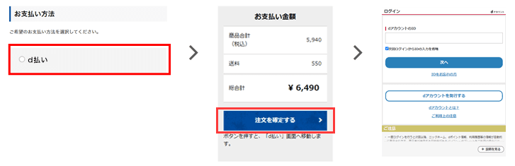 お支払方法に「d払い」をご選択いただき、「注文を確定する」ボタンをクリックすると、dアカウントログイン画面へ移動します。お客さまの「dアカウントID」「パスワード」を入力し、ログイン後に決済へと進みます。決済が完了すると完了画面が表示され、一定時間後に当サイトへ遷移します。
