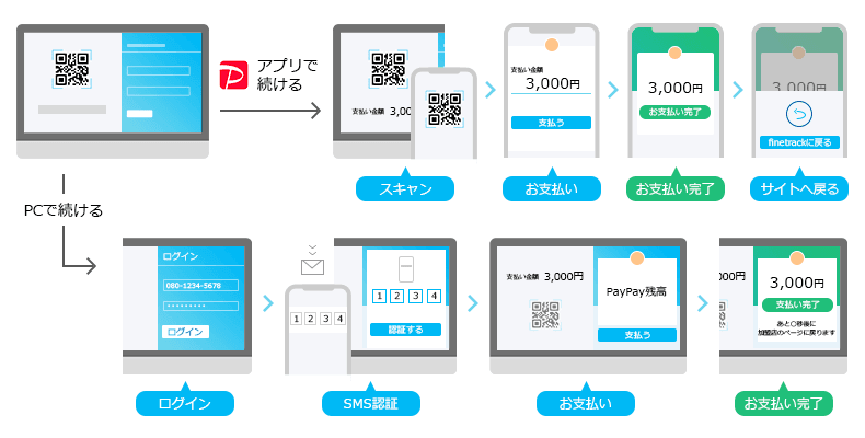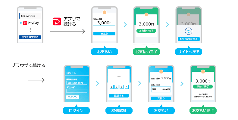 なお、この時点で決済・注文は完了していません。5秒後に自動的に当サイトのご注文完了画面へ遷移した時点でご注文完了となります。PayPayアプリをご利用の方は、お支払い完了後[finetrackに戻る]ボタンから当サイトへお戻りください。こちらもご注文完了画面へ遷移した時点でご注文完了となります。