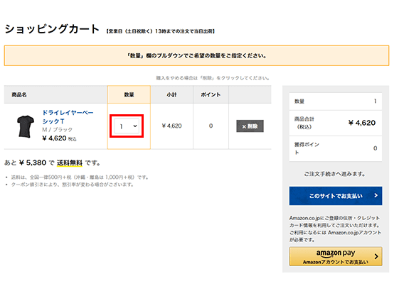カートに入れた商品の内容を確認する画面が表示されます。ここでご希望の数量をご指定ください。