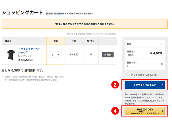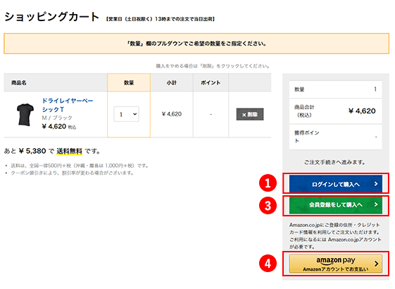 なお、お支払いにAmazon Payを利用する場合は、ログイン状態や会員登録状況に関わらず、「④Amazon Pay Amazonアカウントでお支払い」をクリックし、Amazonにログイン・認証・続行をしてご注文手続き画面にお進みください。