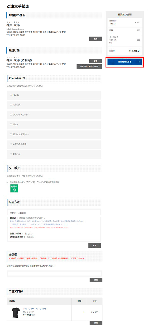ご注文手続き画面にて、「お客様の情報」「お届け先」「お支払い方法」「配送方法」「通信欄」の確認や変更、「ご注文内容」の確認をしていただけます。