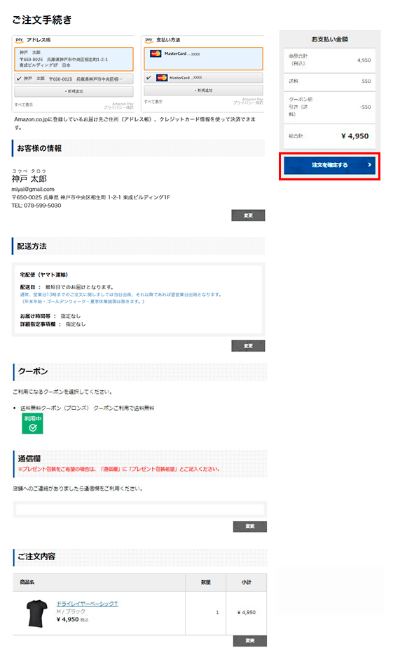 お支払方法にクレジットカード、代金引換、Amazon Payをお選びの方は、ご注文完了画面が表示されご注文完了となります。